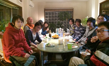 忘年会も兼ねてのギョウザパーティ.ギョウザを作って焼いて食べました. 形も具の量もまちまち. 大笑いしながらの手作業. 最後はミルクプリンとコーヒー.趣味や授業の話で深夜まで盛り上がりました.