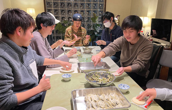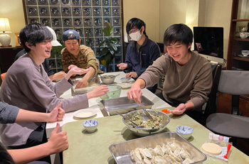 集合してこれから餃子を作ります.指導教官はbe管理人,オーナーのK(右).