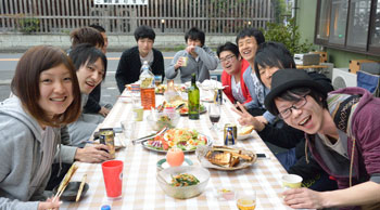 新入生の歓迎会ということで恒例のBBQ,駐車場にテーブルを出し,炭火で牛肉や豚肉,鶏肉にウインナ,イカを焼き,オーナーKの手作り野菜たっぷりサラダを食べました..
