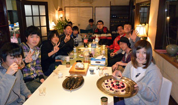 忘年会も兼ねてのギョウザパーティ.ギョウザを作って焼いて食べました. 形も具の量もまちまち. 大笑いしながらの手作業. 最後はミルクプリンとコーヒー.趣味や授業の話で深夜まで盛り上がりました.